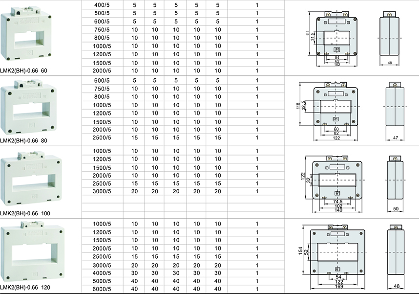 LMK2(BH) - 0.66 type current transformer is mainly used for indoor, for rated voltage up to and including 0.66 kV, rated frequency 50Hz ac circuit as the electric current and electric energy measurement and relay protection. Product is a plastic shell type current transformer, are widely used in the complete sets of cabinet put oneself in another's position, its installation method can be used bus fixed and base plate fixed installation method, suitable for any direction installation, a conductor for bus or cable.
