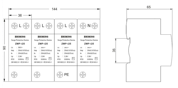 ZMP-I25系列限壓型電涌保護器(屬于一級防雷器,10/350μs波形)依據(jù)IEC和GB標準設計。應用于雷擊風險較高地區(qū)的設備系統(tǒng)的電源第一級電涌保護。可防范直擊雷在內的各種電涌電流,通過不同數(shù)量的組合可適用于單相、三相供電線路,模塊化設計,標準35mm導軌式安裝方式,安裝于建筑物總配電柜(箱)、室外配電柜(箱),具備很高的雷電流泄放能力,無續(xù)流,單模塊最大沖擊電流(10/35μs)分別可達Iimp=15kA,Iimp=25kA, Iimp=35kA, Iimp=50kA最大放電電流(8/20μs)可分別達到Imax=100kA, Imax=150kA, Imax=160kA, Imax=200kA