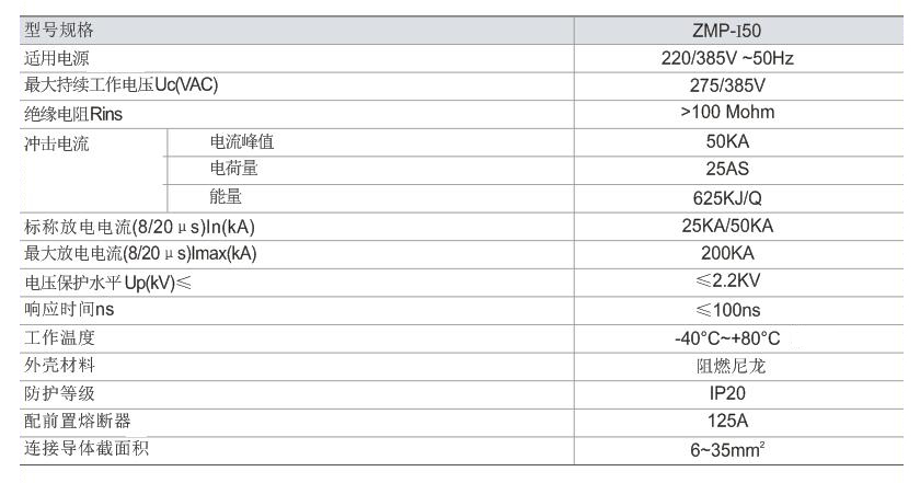 ZMP-I50系列限壓型電涌保護(hù)器(屬于一級防雷器,10/350μs波形)依據(jù)IEC和GB標(biāo)準(zhǔn)設(shè)計。應(yīng)用于雷擊風(fēng)險較高地區(qū)的設(shè)備系統(tǒng)的電源第一級電涌保護(hù)??煞婪吨睋衾自趦?nèi)的各種電涌電流,通過不同數(shù)量的組合可適用于單相、三相供電線路,模塊化設(shè)計,標(biāo)準(zhǔn)35mm導(dǎo)軌式安裝方式,安裝于建筑物總配電柜(箱)、室外配電柜(箱),具備很高的雷電流泄放能力,無續(xù)流,單模塊最大沖擊電流(10/35μs)分別可達(dá)Iimp=15kA,Iimp=25kA, Iimp=35kA, Iimp=50kA最大放電電流(8/20μs)可分別達(dá)到Imax=100kA, Imax=150kA, Imax=160kA, Imax=200kA