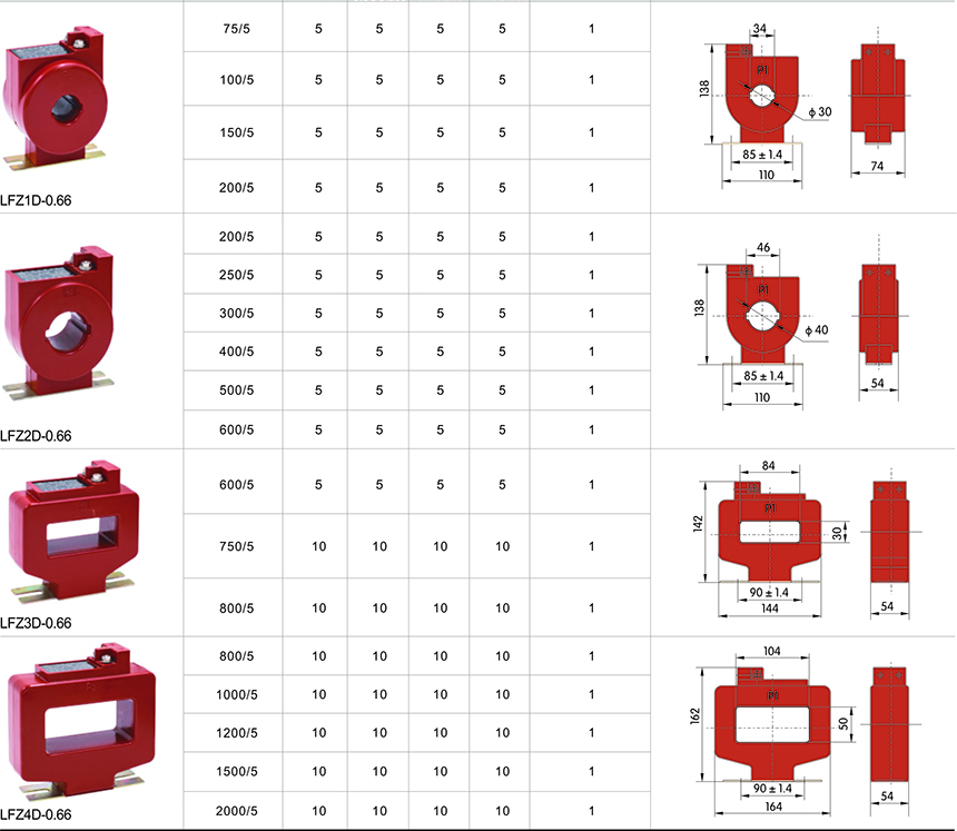 For example: solid order LMZ1D-0.66, Bus width is 30mm,rated output current ratio 150/5 A and 5 VA,Accurate magnitude 0.5 magnitude of transformer.