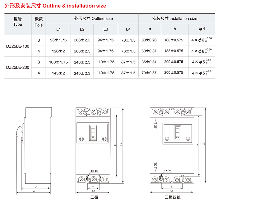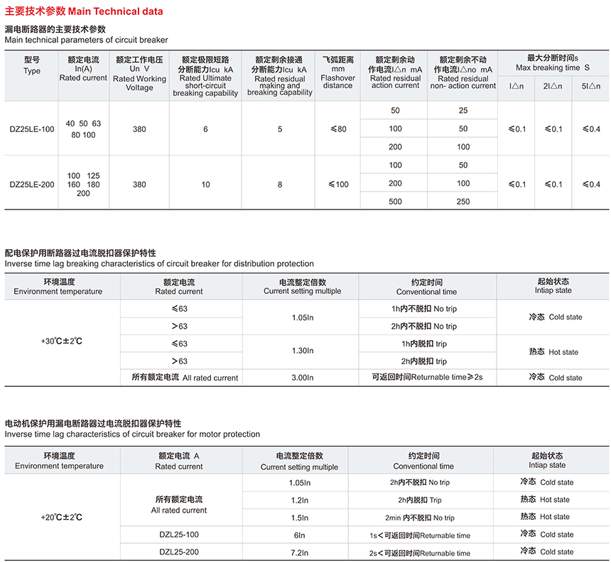 DZ25LE series leakage circuit breaker (hereinafterreferred to as leakage circuit breaker) is suitable fordistributing network of AC 50Hz, rated working voltage 380V, rated current 200A, to make indirect contactprotection to the human being, also to prevent fireaccident caused by ground fault current due to thedamage of insulation of equipment. In addition, it notonly can distribute the energy and protect the circuitand power equipment against overload and short circuit,but also can be used to infrequently start the motor.The products are in conformity with such standardsas GB 6829, GB 14048.2, IEC 60755 and IEC 60947.