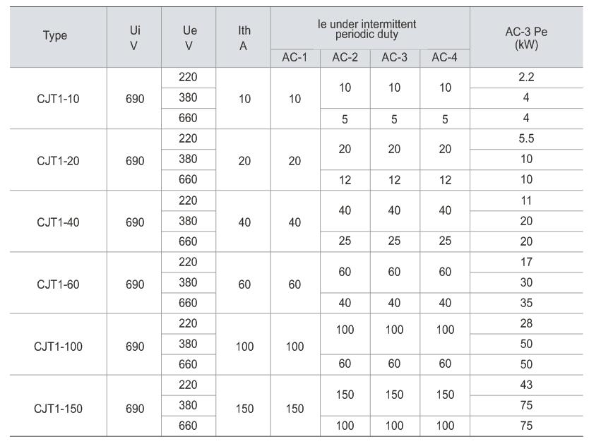 CJT1 series AC contactor (hereinafter referred to ascontactor) is suitable for the power system of AC 50Hzand rated working voltage up to 660V or the power system of rated working current up to 150A at 380Vand rated working current up to 100A at 660V underAC-3 utilization, to make and break circuit in a fardistance, or to frequently start and control AC motor.The contactor can be combined with thermal overloadrelay or electronic protection equipment to form intoan electromagnetic starter, to protect the circuit againstpossible overload. The products are in conformity withsuch standards as GB 14048.4 and IEC 60947-4-1.