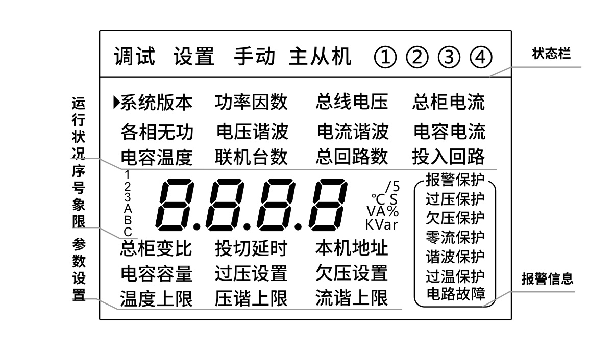 顯示屏采用段碼液晶屏,中文界面,實(shí)時顯示當(dāng)前電容器溫度,電流電壓及諧波參數(shù),通過按鍵查詢各種參數(shù)及設(shè)備運(yùn)行狀態(tài),還可設(shè)置過電壓、欠電壓、欠電流、過溫度、過、欠補(bǔ)償?shù)雀餍袇?shù)并存儲,掉電數(shù)據(jù)不丟失;
