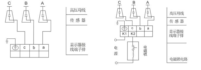 戶內(nèi)高壓帶電顯示裝置由三個(gè)傳感器和一個(gè)顯示器經(jīng)導(dǎo)線連接組成。適用于額定頻率50Hz,額定電壓40.5kV以下的戶內(nèi)高壓電氣設(shè)備上,既可反映回路帶電狀況,還可與電磁鎖配合,實(shí)現(xiàn)強(qiáng)制閉鎖開關(guān)手柄、閥門等。帶電顯示和強(qiáng)制閉鎖均受同一高壓信號所控制,但電路系統(tǒng)又是相互獨(dú)立、互不干擾,只要高壓回路帶電,即使顯示電路和閉鎖電路同時(shí)出故障,電磁鎖仍處于閉鎖狀態(tài),達(dá)到防止誤操作,誤入帶電間隔。
