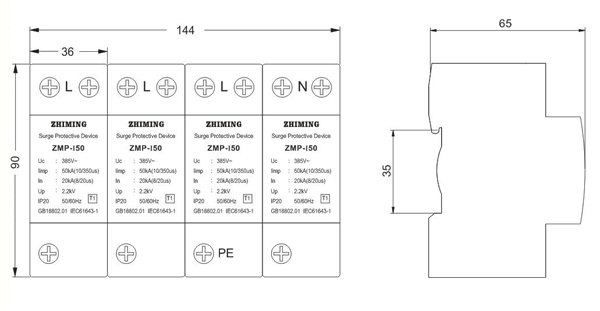 ZMP-I50系列限壓型電涌保護(hù)器(屬于一級防雷器,10/350μs波形)依據(jù)IEC和GB標(biāo)準(zhǔn)設(shè)計。應(yīng)用于雷擊風(fēng)險較高地區(qū)的設(shè)備系統(tǒng)的電源第一級電涌保護(hù)??煞婪吨睋衾自趦?nèi)的各種電涌電流,通過不同數(shù)量的組合可適用于單相、三相供電線路,模塊化設(shè)計,標(biāo)準(zhǔn)35mm導(dǎo)軌式安裝方式,安裝于建筑物總配電柜(箱)、室外配電柜(箱),具備很高的雷電流泄放能力,無續(xù)流,單模塊最大沖擊電流(10/35μs)分別可達(dá)Iimp=15kA,Iimp=25kA, Iimp=35kA, Iimp=50kA最大放電電流(8/20μs)可分別達(dá)到Imax=100kA, Imax=150kA, Imax=160kA, Imax=200kA